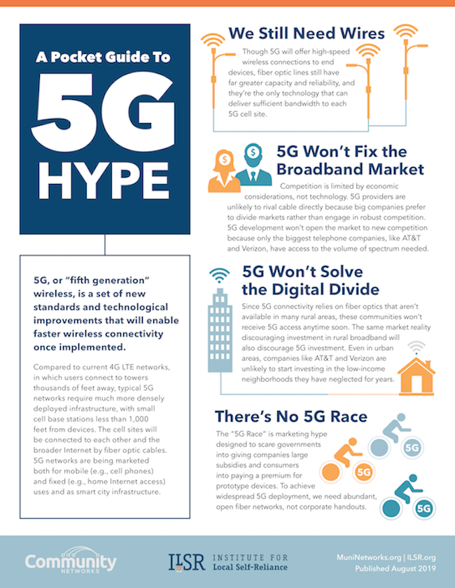 What is not really addressed in all the hype over 5G, though, is the nagging issue of access: where will it be deployed, for whom, and for how much (and with what kind of data caps)? We know that the telecoms’ prevailing practice in these matters is to cherry pick the best areas with the highest density and throw everyone on the margins to the wolves. In that regard, new technology is nice, but without the right policies and institutions, the benefits of those technologies will be unevenly experienced and will do nothing to change the status quo – points well made by the Institute for Local Self-Reliance in the following fact sheet: