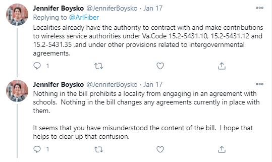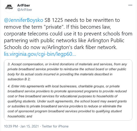 TLDR Version (Update below): State Senator Jennifer Boysko has introduced a bill (SB 1225) in the 2021 session of the Virginia General Assembly that will establish new rules for local schools on partnering with an internet service provider to connect households with disadvantaged students. These rules would exclude public broadband providers by virtue of only mentioning “private” broadband providers. In addition to a number of stopgap solutions, during the pandemic local school districts have partnered with public providers to get kids connected. For instance, Arlington Public Schools partnered with Arlington County’s public dark fiber network to extend wifi to several buildings with a high-concentration of low-income families. Boysko’s bill, if passed in current form, would at best complicate future such public-public partnerships and at worst eliminate them entirely. Update below.